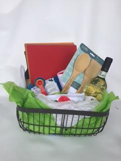 Bonus items include: Cutting Boards, Measuring spoons, cooking utensils, kitchen towels, produce basket and a bottle of wine.