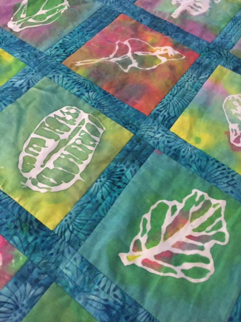 Beautiful Handmade custom leaf quilt with panels created by our amazing 1st grade class!! Throw size and perfect for a child's room, couch, beach house or anywhere you want to add some amazing tranquil color! Truly priceless!